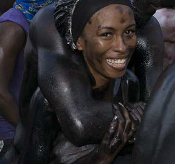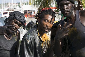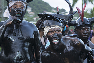 Jab, which comes from the French word ‘diable’ meaning ‘devil’, is a distinctly percussive sound with a three-beat repeated refrain (often rung out on a conch shell). The word also refers to the devil masqueraders in Carnival (called Spice Mas in Grenada) who, smeared in black oil, mud or paint, wearing horns and carrying chains, whips or even serpents, depict the evils meted out to enslaved Africans by their colonial masters.