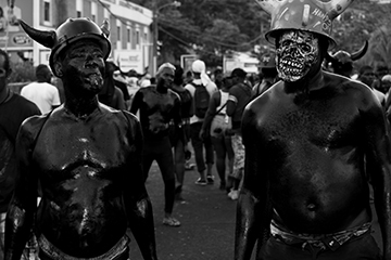 Mas Origins and History: Portrayals of various devils have been popular throughout the history of Carnival, but the combination of devil mas and molasses may be one of convenience (a dark substance available to smear the body and a popular portrayal) or be designed to recall a history of slavery. It is known that white masqueraders would smear themselves with varnish or other dark pigment when playing as the Negue Jadin, a satire of estate Negroes. Additionally, L.M Fraser, in History of Carnival relates that